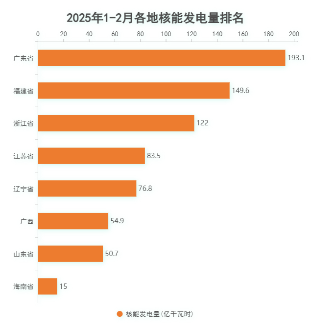 2025年1-2月各地規(guī)上核能發(fā)電量,排名前五的分別是:廣東省193.1億千瓦時、福建省149.6億千瓦時、浙江省122億千瓦時、江蘇省83.5億千瓦時、遼寧省76.8億千瓦時。
